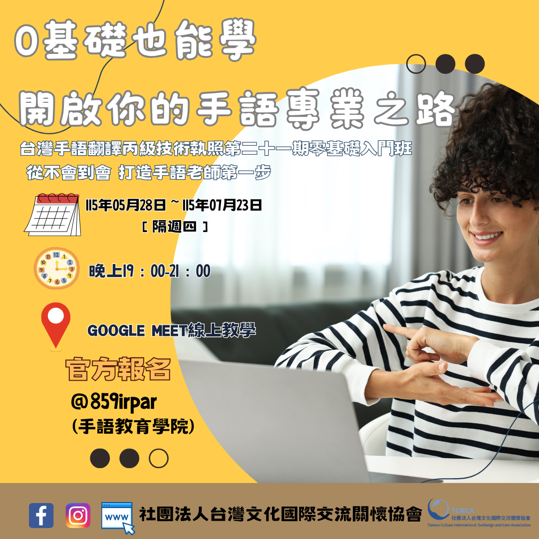 On 2026 年 4 月 9 日 By tcieca in 招生 台灣手語丙照0基礎班第二十一 期 你是否曾想學手語,卻不知道從哪開始? 這堂【零基礎班】專為完全沒有經驗的你設計, 從最基礎教起,帶你建立: ✔ 手語理解能力 ✔ 基本表達能力 ✔ 溝通與應用能力 不只是興趣培養,更是未來專業發展的起點! 讓你從「看不懂」到「敢開口比」, 逐步邁向手語老師與證照之路。 ⭐ 課程特色 ✔ 零基礎友善|完全新手也能輕鬆上手 ✔ 系統化教學|循序漸進不混亂 ✔ 生活化手語|學了就能立即應用 ✔ 專業培訓路徑|銜接丙照與師資班 ✔ 線上學習|在家就能學習無負擔 🎥 課程亮點 📌 附課程短影音複習 📌 可反覆觀看練習 📌 學習不中斷、進步更穩定 📝 報名資訊 👉 報名網址 https://reurl.cc/ov5625 📞 課程諮詢 🟩 手語教育學院 官方LINE https://lin.ee/TyXz0uF 📱 張必瑩 Line ID 0985898755 📢 重要提醒 📌 培訓目標:報考學校手語老師 📌 強化教學能力與專業實務 📌 115年起「教支老師」名稱調整為「手語老師」 ※ 依教育部公告為準 🤟 如果你還不會手語 現在,就是開始的最佳時機! 如果你已經會手語 現在,就是升級成「手語老師」的最佳時機! 🏢 主辦單位 社團法人台灣文化國際交流關懷協會 📧 Email|mail@tcieca.org 🌐 官網|https://tcieca.org 🎓 文化 e 學院|https://culturee.com.tw ▶️ YouTube|https://www.youtube.com/@tcieca #手語班 #台灣手語 #手語丙照班 #手語老師 #親子手語班 #CODA手語班 #幼兒手語 #聾人文化 #手語納入國民教育 #手語文化 #文化e學院 #特殊教育參訪 #手語旅遊團 #本協會依法合規辦理課程請安心研習手語
